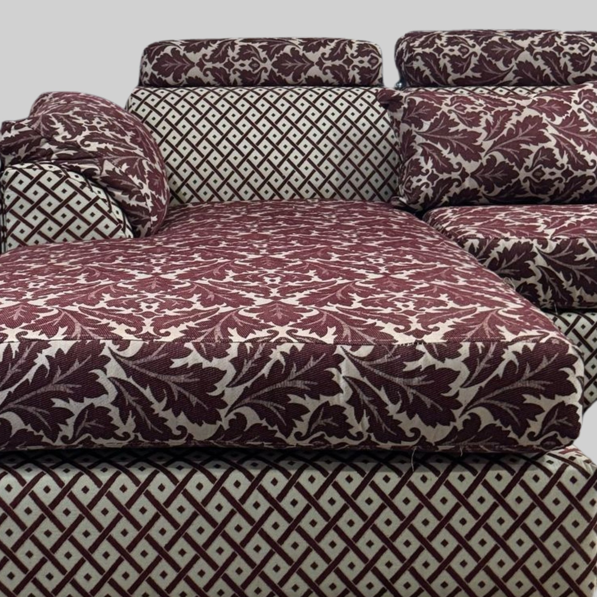 Elevate your living space with the Royal Corner Sofa, a beautifully crafted piece that blends classic design with contemporary comfort. Upholstered in a striking combination of rich maroon damask and geometric diamond-patterned fabric, this luxurious corner unit offers both visual appeal and spacious seating.